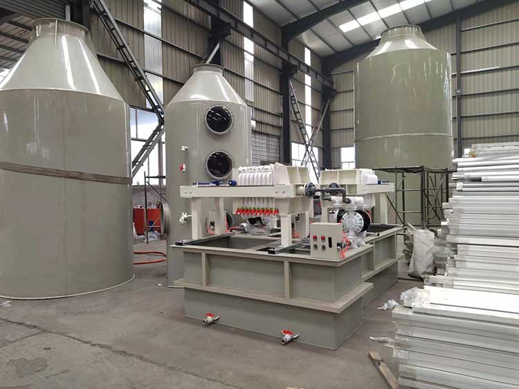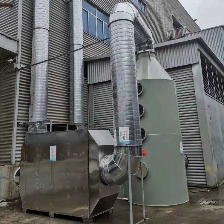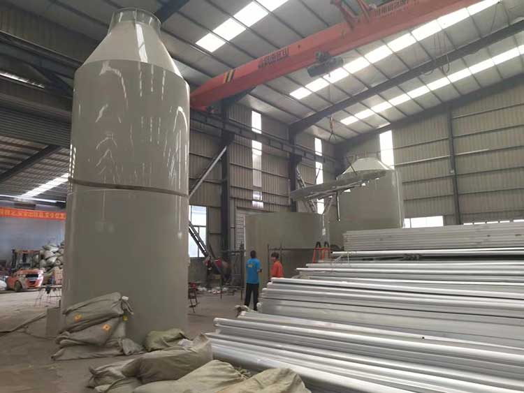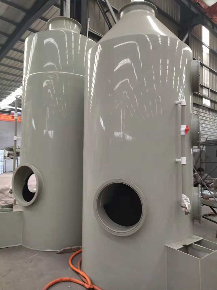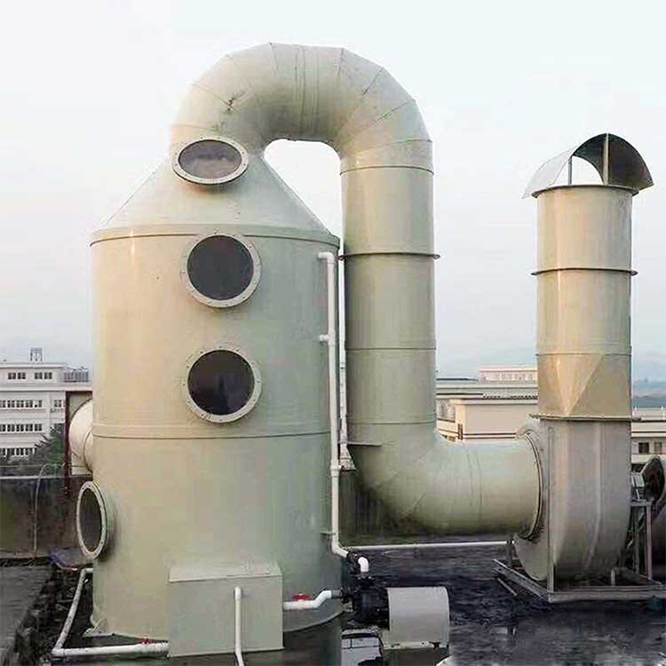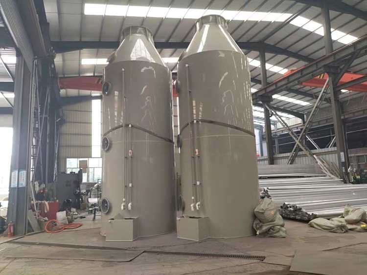 废气净化塔利用气体与液体间的接触,而将气体中的污染物传送到液体中,然后再将清洁气体与被污染的液体分离,达到清净空气的目的。废气经由废气净化塔,采用气液逆向吸收方式处理,即液体自塔顶向下以雾状(或小液滴)喷撒而下。废气则由塔体(逆向流)达到气液接触之目的。此处理方可冷却废气、调理气体及去除颗粒,再经过除雾段处理后,排入大气中。