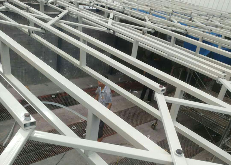 三、顶部伸缩喷漆房是移动伸缩喷漆房的一种,伸缩顶蓬两端有固定的支撑,伸缩装置在固定支撑上面伸缩移动,方便工件运转。以下为您展示安装图片。