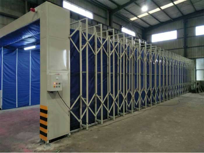 整体为框架传动结构,每组框架间均有阻燃PVC布密封连接,安装快捷、外形美观;工作中房体沿地面铺设的轨道前后伸缩移动,采用两边分别驱动,互相连锁的方式运行,前后安全限 位控制,机械运行安全稳定,操作简单,使用方便。在不喷漆的工作时间内,可将前室收拢,腾出空间场地作为其他与喷漆交叉作业的工序使用。